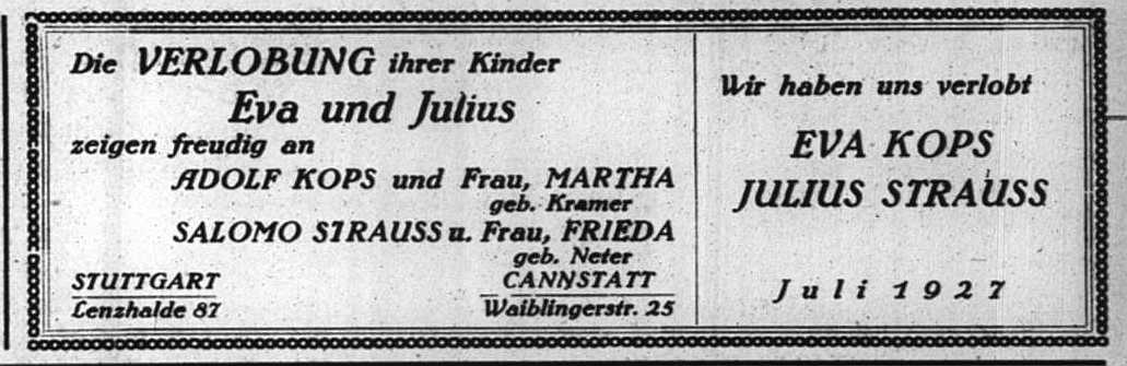 Verlobungsanzeige von Eva Kops und Julius Strauss (1927)