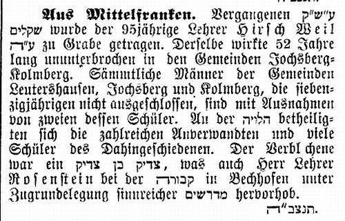 war 52 Jahre lang Lehrer in Colmberg und Jochsberg Hirsch Weil. Er starb