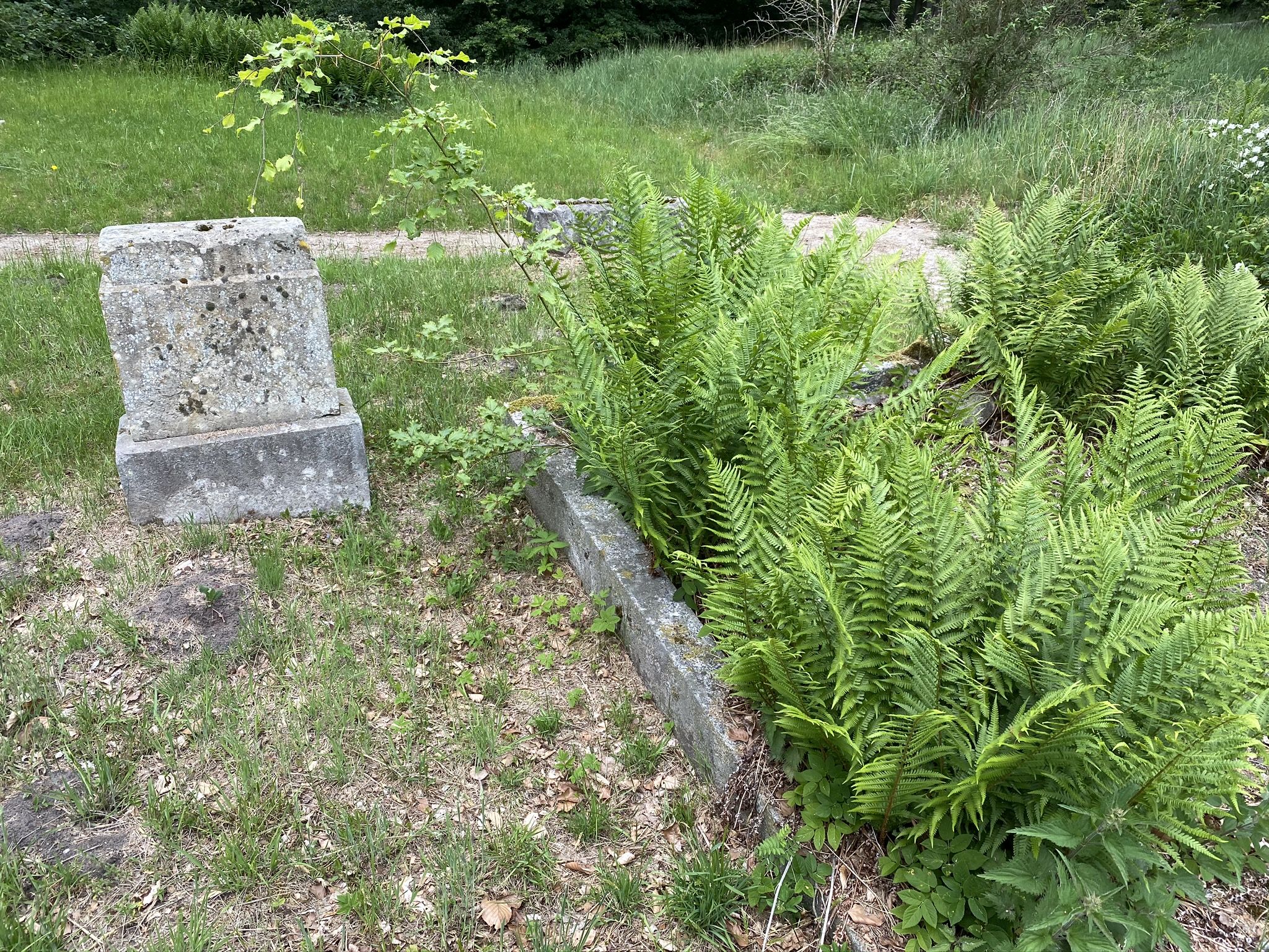 einige Grabumrandungen und Sockel von etwa zehn Grabsteinen erhalten sowie die