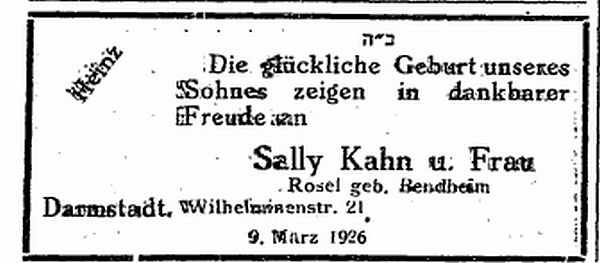 eines Sohnes von Sally Kahn und Rosel geb. Bendheim (1926)