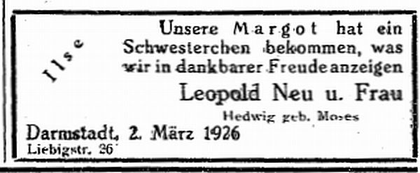 einer Tochter von Leopold Neu und Hedwig geb. Moses (1926)