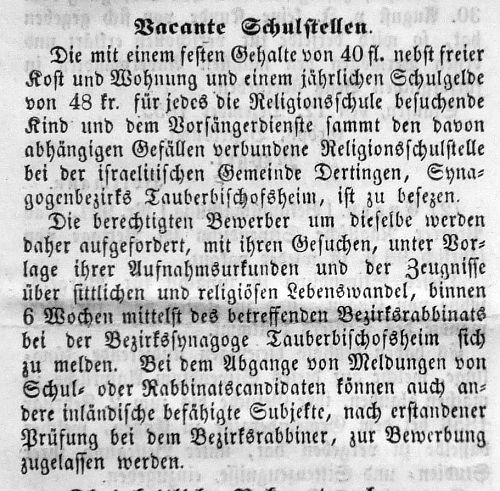 Dertingen, Synagogenbezirks Tauberbischofsheim, ist zu besetzen.