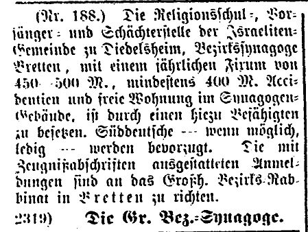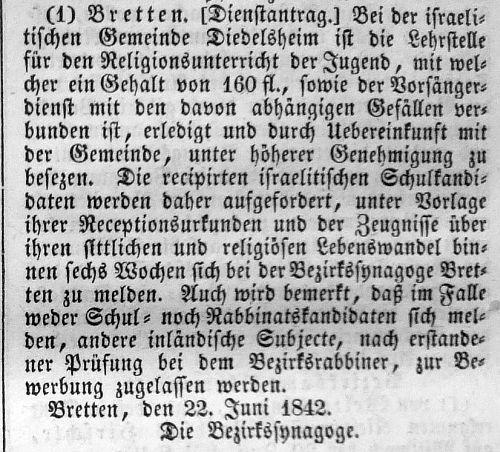 Synagogenbezirks Bretten, ist der Religionsschul- und Vorsängerdienst, mit