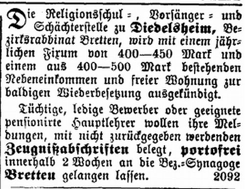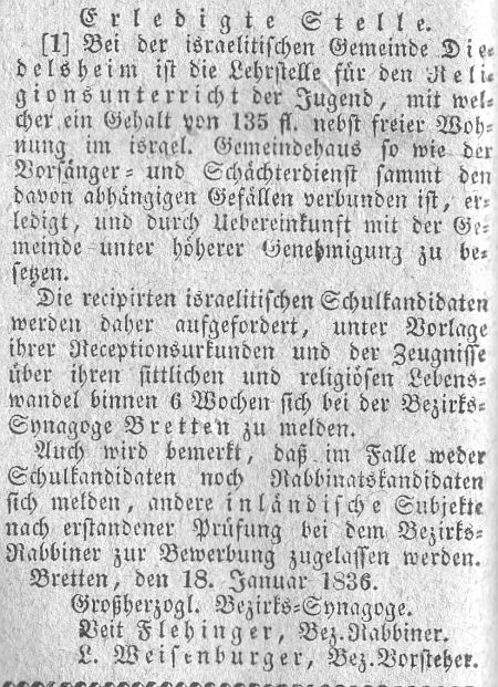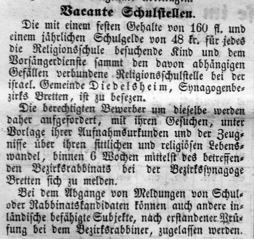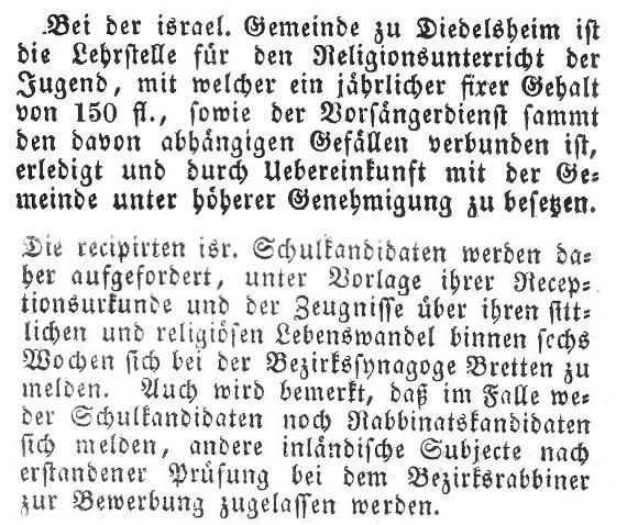 "Bei der israelitischen Gemeinde zu Diedelsheim ist die Lehrstelle für den