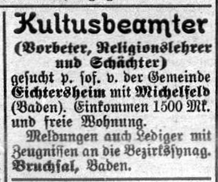 führte. Bis 1875 war Lehrer Reichenberger in Eichtersheim. Von 1875 bis 1903 wirkte in Eichtersheim der bei den Berichten unten