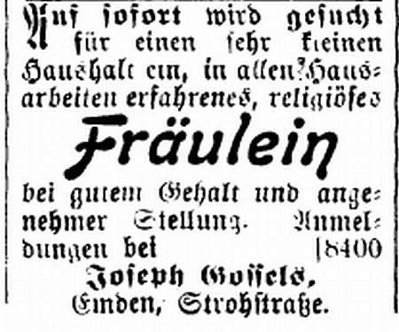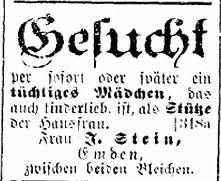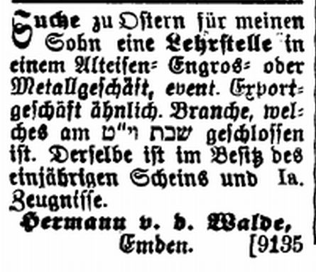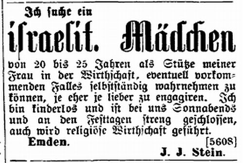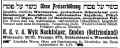 Anzeige in der Zeitschrift "Der Israelit" vom