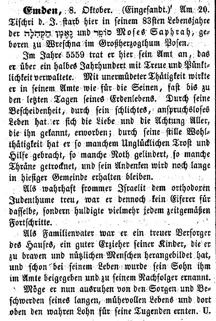 Moses Saphra, geboren zu Wreschna im Großherzogtum Posen.