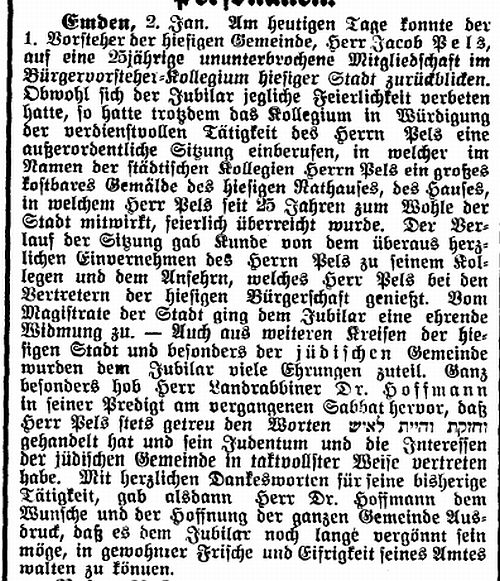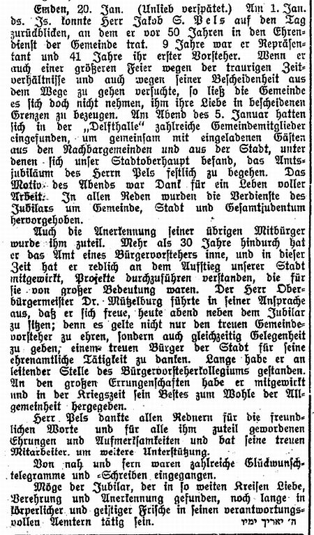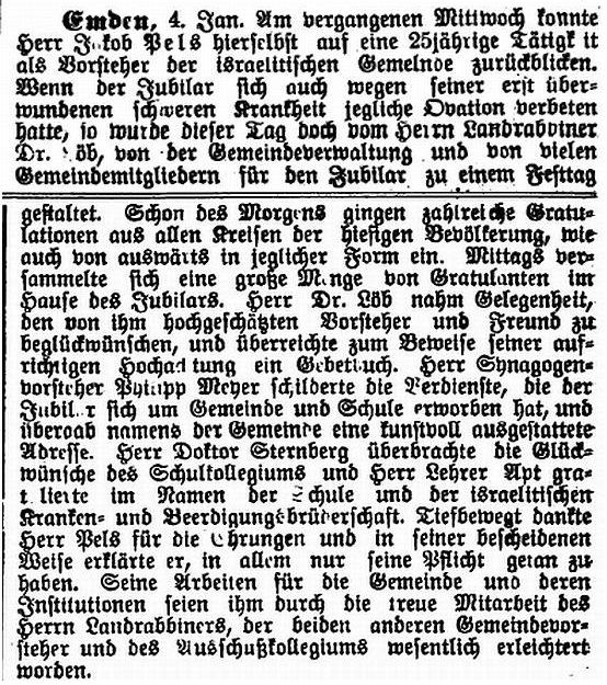 25-jährige Tätigkeit von Jakob Pels als Vorsteher