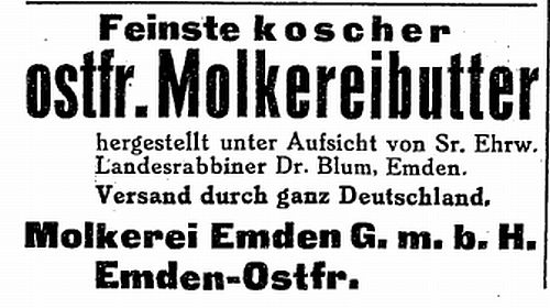 Anzeige für koschere Molkereibutter der Molkerei Emden