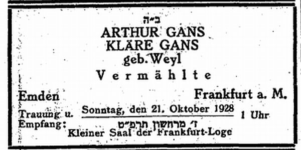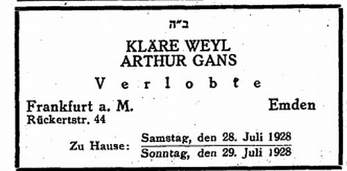 Verlobungs- und Hochzeitsanzeige von Kläre Weyl und Arthur Gans
