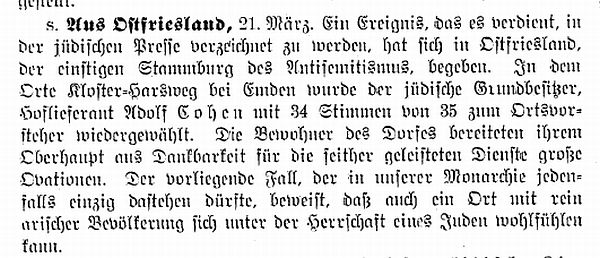 Adolf Cohen wurde in Kloster-Harsweg zum Ortsvorsteher