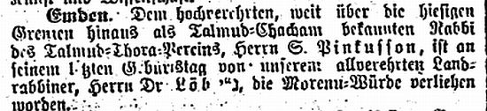 Morenu-Würde (Ehrenrabbiner) für Herrn S. Pinkusson
