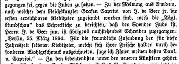 de Beer schickt die ersten Kiebitzeier an den Reichskanzler Graf Caprivi (1894)