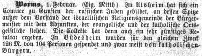 in "Die jüdische Presse" vom 4. Februar 1892: "Worms, 1. Februar