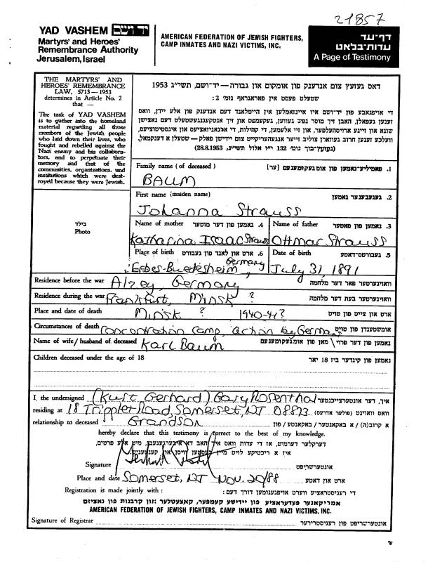 Gewaltherrschaft in Deutschland 1933-1945"): Johanna Baum geb. Strauss