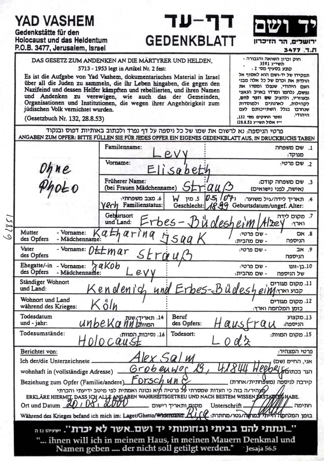 Strauss (1897), Jacob Levy (1900), Käthe Levy (1936), Kurt Levy (1931), Auguste
