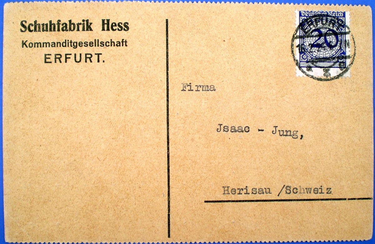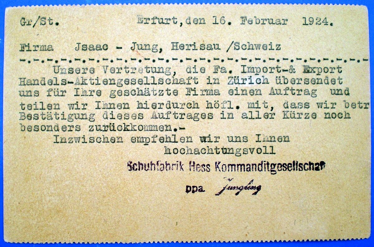Postkarte der Schuhfabrik Hess, Kommanditgesellschaft, Erfurt, verschickt am 16. Februar 1924 an die