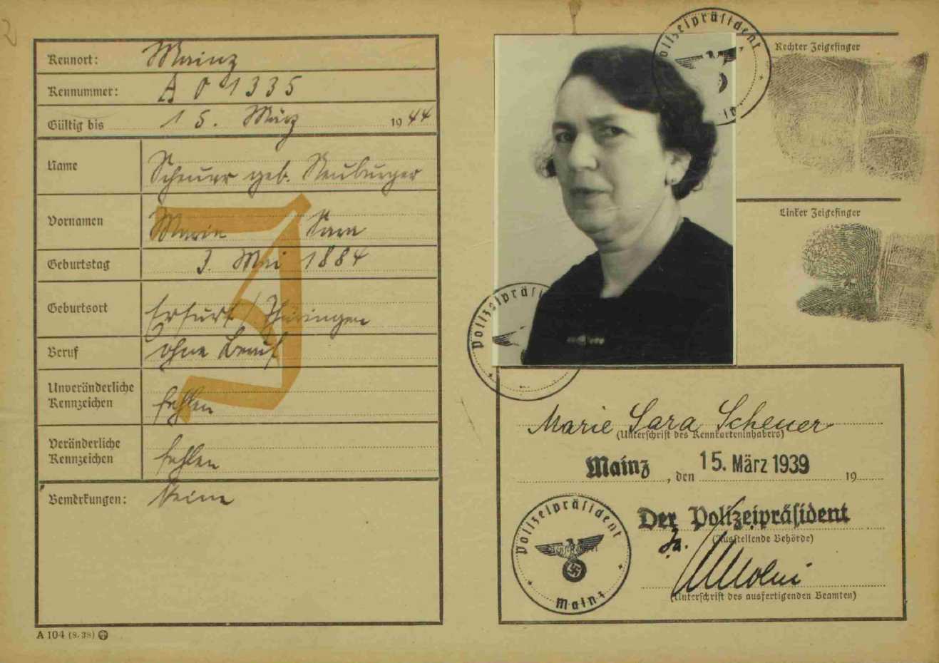1939 in Mainz ausgestellt; Sie konnte vor den Deportationen