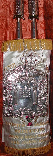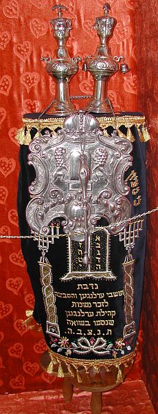 Torarollen im neuen Betsaal; links mit Widmungsinschrift. |