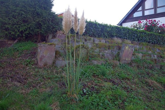 hineingebaut; die hier stehenden Grabsteine von den Betonsteinen umgeben. |