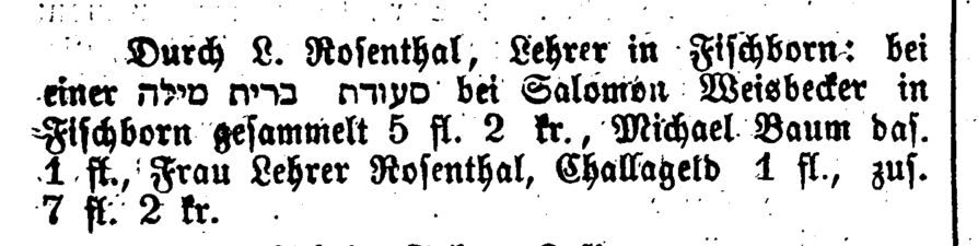 war. Um 1869/70 wird als Lehrer in Fischborn L. Rosenthal genannt. Als die Zahl