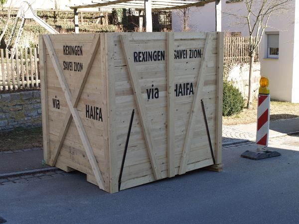 An der Freudenstädter Straße: Nachbau eines sog. "Lift" = Holzcontainer, mit dem Möbel und Hausrat jüdischer Familien 1938 verfrachtet wurden | Die Ausstellung ist im Kirchenraum, der auf Höhe der ehemaligen Frauenempore eingerichtet wurde. Teile der Gitter der Frauenempore sind erhalten. | |
