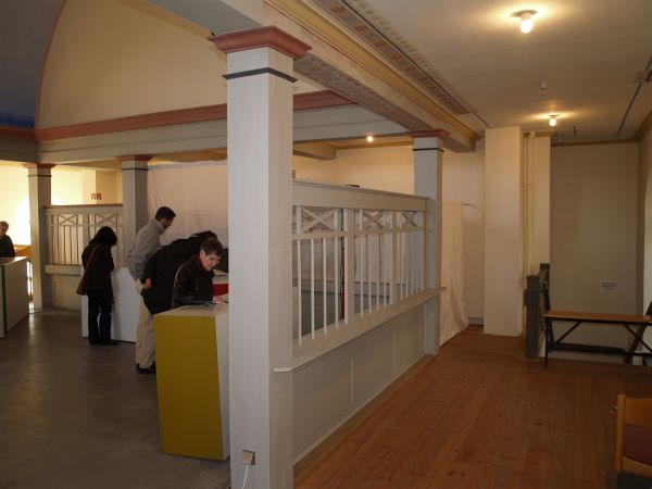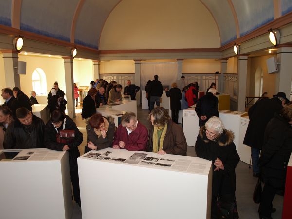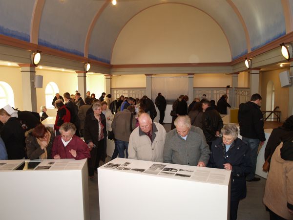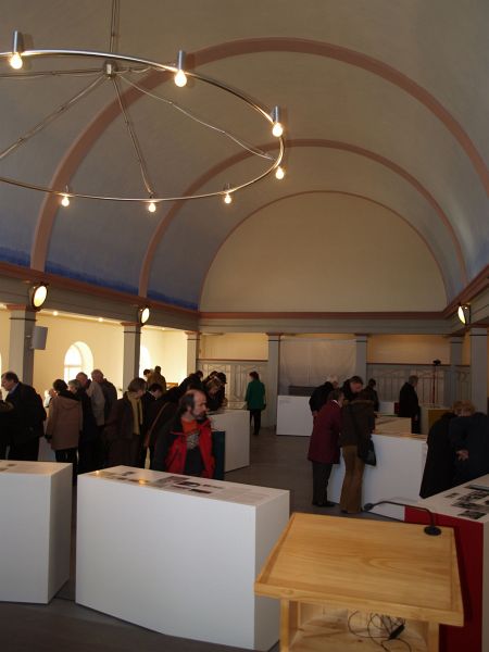 Blick in den Ausstellungsraum auf Höhe der früheren Frauenempore. Zahlreiche Besucher zeigen großes Interesse an der Ausstellung | ||