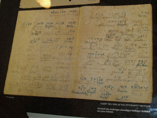 Einzelne Vitrine mit dem Original eines hölzernen Grabschildes für den im Dezember 1941 gestorbenen Siegfried Lemberger | Gebetbuch von Wilhelm Wälder, 1945 in der ehemaligen Synagoge gefunden | Schulheft (Schule in Shavei Zion) des 42-jährigen ehemaligen Tuttlinger Viehhändlers Julius Fröhlich |