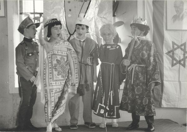 Kinder der Israelitischen Kultusgemeinde Schwaben-Augsburg in Purim-Kostümen (um 1960) | Purim-Rassel mit