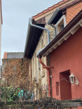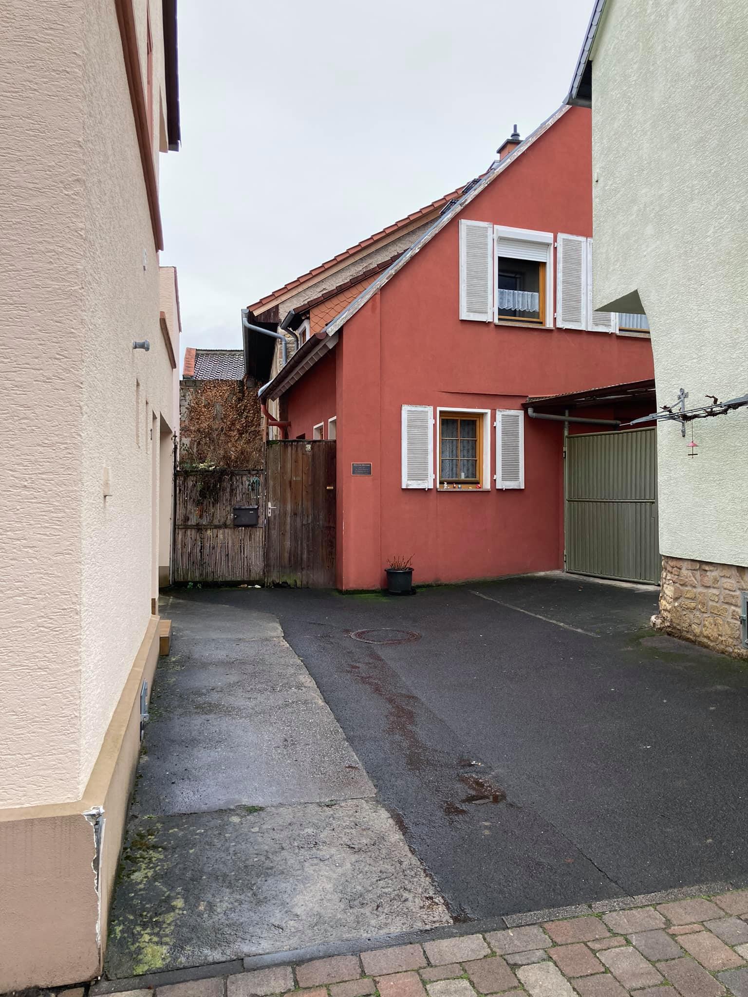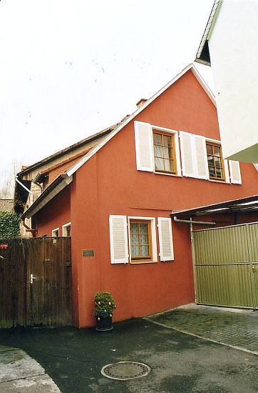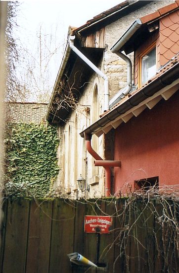 ehemalige Synagoge ist hinter dem rot gestrichenen Gebäude erkennbar