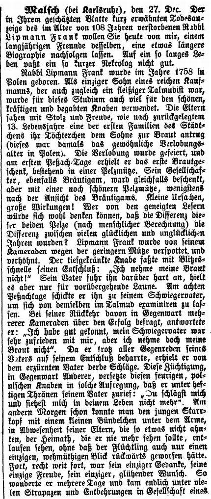 in der Zeitschrift "Der Israelit" vom 9. Januar 1867: "Malsch