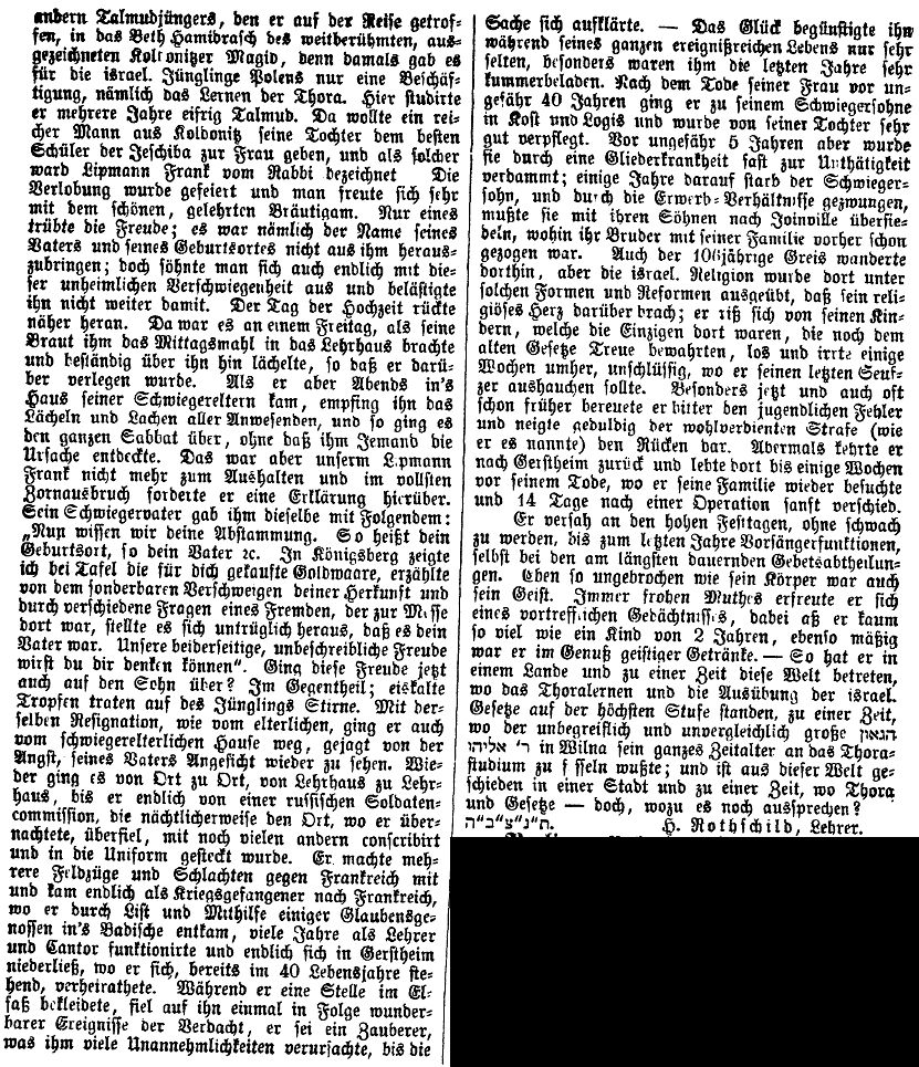 Jeschiba zur Frau geben, und als solcher ward Lipmann Frank vom Rabbi