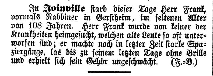 Frank, vormals Rabbiner in Gerstheim, im seltenen Alter von 108