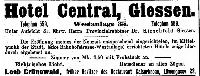 Loeb Grünewald, früher Besitzer des Hotels Kaiserkrone, Löwengasse 22." |