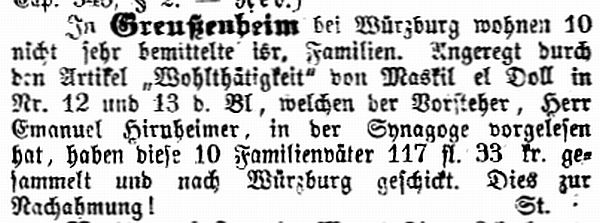 jüdischen Familien in Greußenheim sammeln Spendengelder (1869)