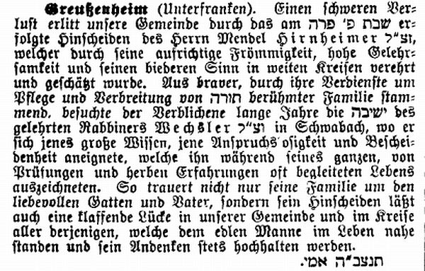 Zum Tod von Mendel Emanuel Hirnheimer (1898)