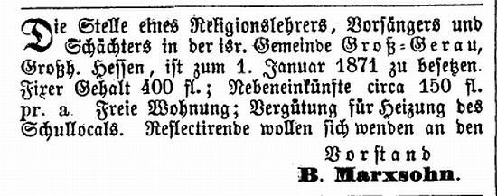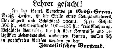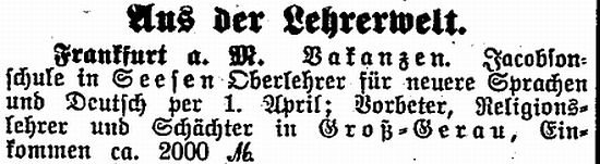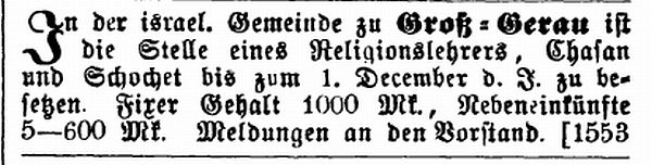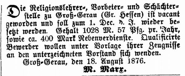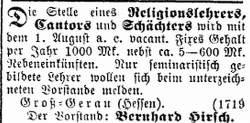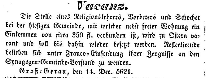 Vorbeter und Schochet tätig war (Ausschreibungen der Stelle siehe unten). Seit