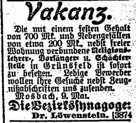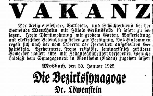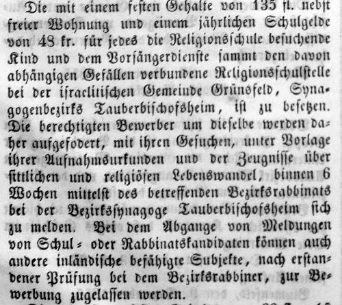 Ausschreibungen der Stelle unten). 1827 wurde die Gemeinde dem Rabbinatsbezirk Wertheim