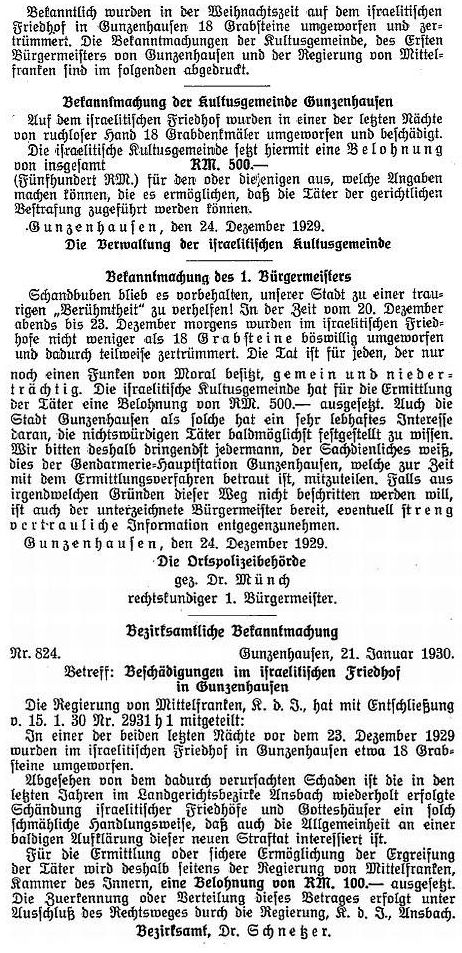 Gunzenhausen, den 24. Dezember 1929. Die Verwaltung der israelitischen