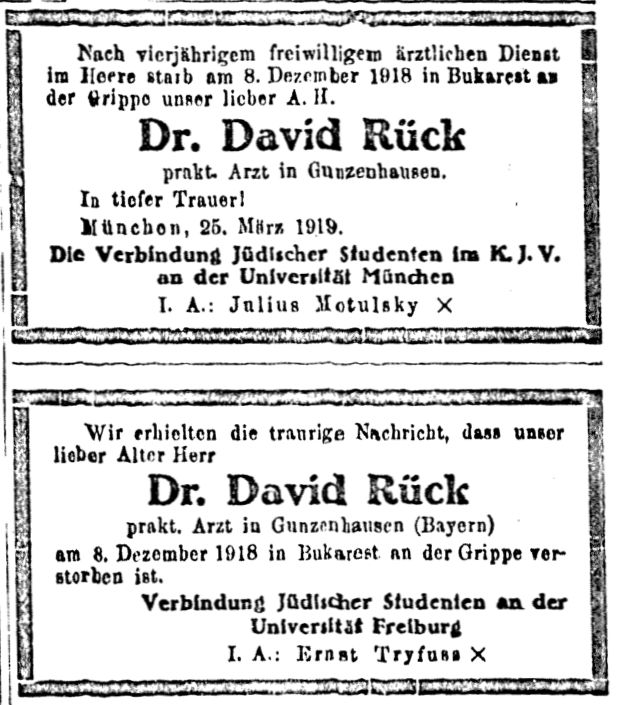 Dezember 1918 in Bukarest an der Grippe unser lieber Alter Herr