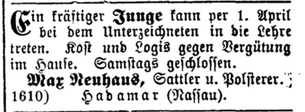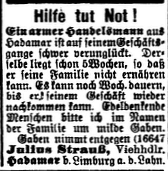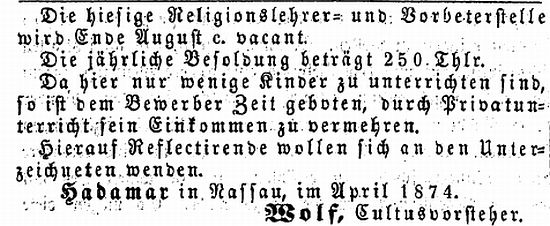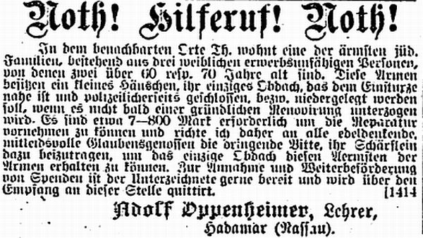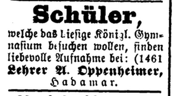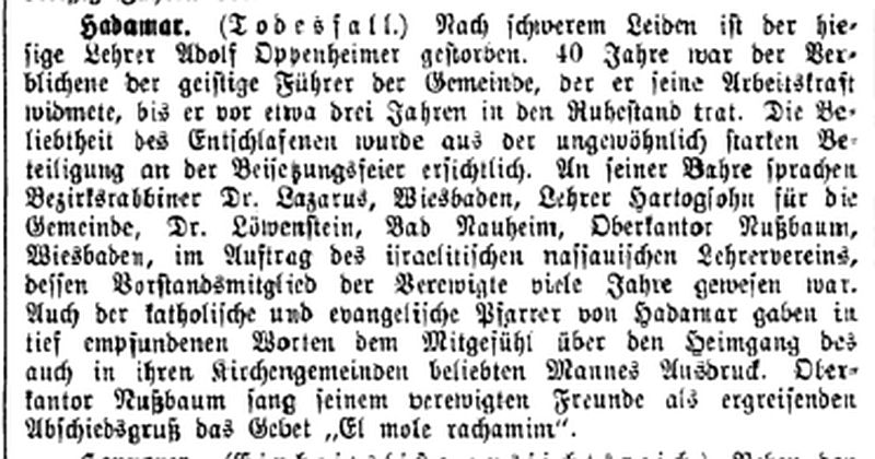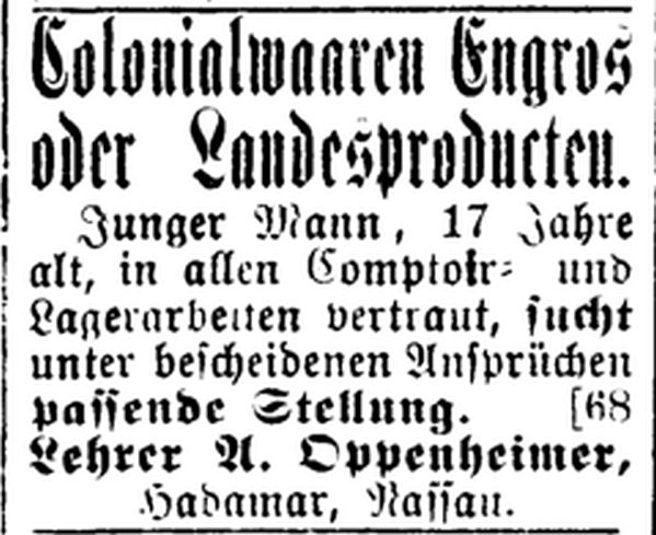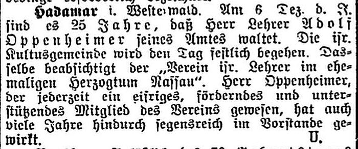 Um 1881 amtierte Lehrer Ostermann in Hadamar. Seit Dezember 1883 war Adolf Oppenheimer Lehrer in der Gemeinde: er