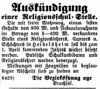 "Auskündigung einer Religionsschul-Stelle. Die mit freier Wohnung,