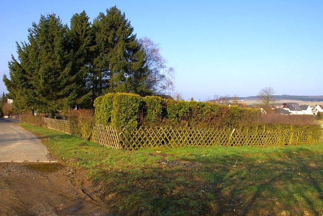 Der Friedhof ist von einer Hecke umgeben. Rechts des Eingangs befindet sich eine