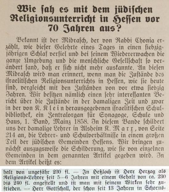 Lehrer Herzog ("Der israelitische Volksschullehrer" von November 1857: "In Heßloch hat Herr Lehrer Herzog eine recht gute, wenn auch nicht definitive
