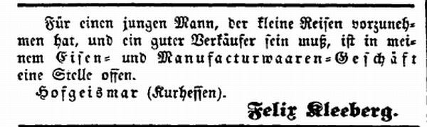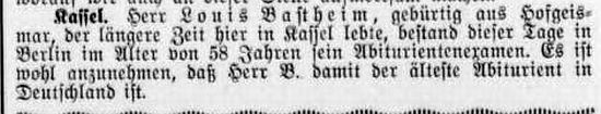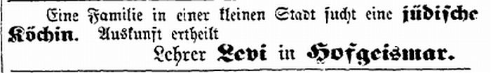 Schulen in Kurhessen. 1876 wird als Lehrer Moses Levv [Levi] genannt (siehe Anzeige
