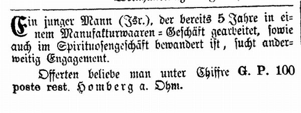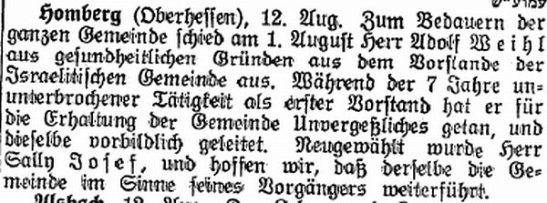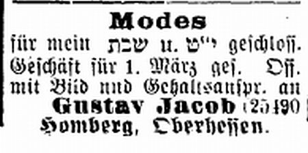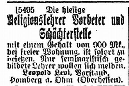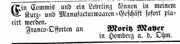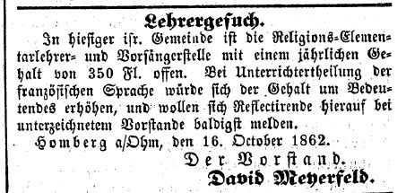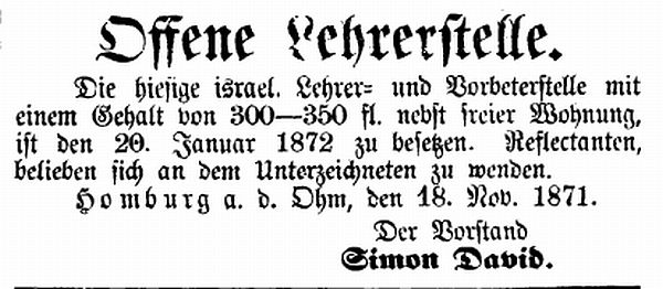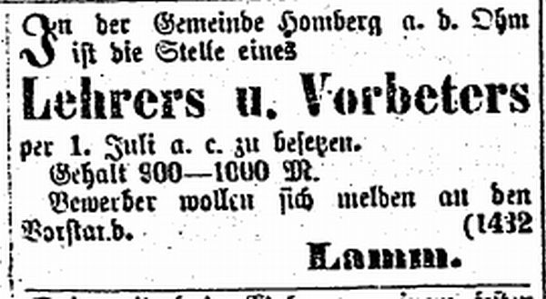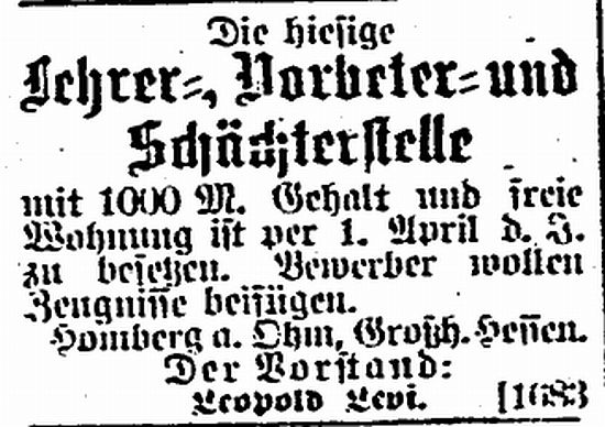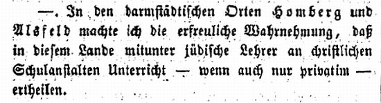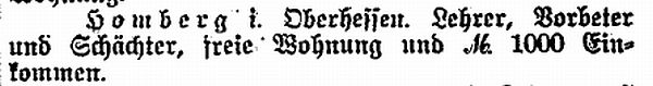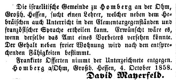 in der "Allgemeinen Zeitung des Judentums" vom 11. Januar 1858: "Die israelitische Gemeinde zu Homberg an der Ohm, Großherzogtum