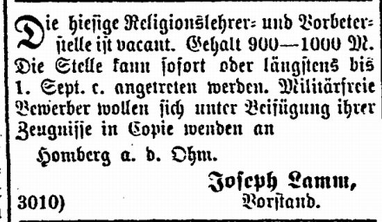 Ausschreibungen der Stelle unten). Als Lehrer wird genannt: um 1860 Lehrer