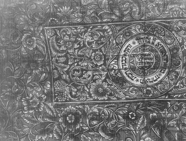 Jerusalem mit dem Tempelgebäude. Über dem Medaillon ein Korb mit