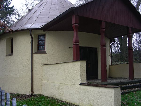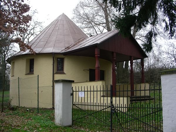 "Predigerhalle", ein Rundbau mit einem hölzernen Vordach;
