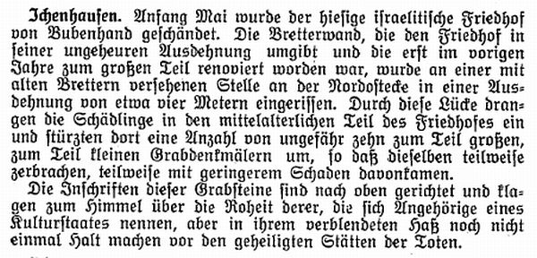 "Ichenhausen. Anfang Mai wurde der hiesige israelitische